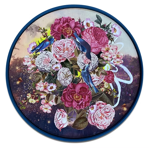 Mixed media on wood panel60cm round Oil paint, and spray paint